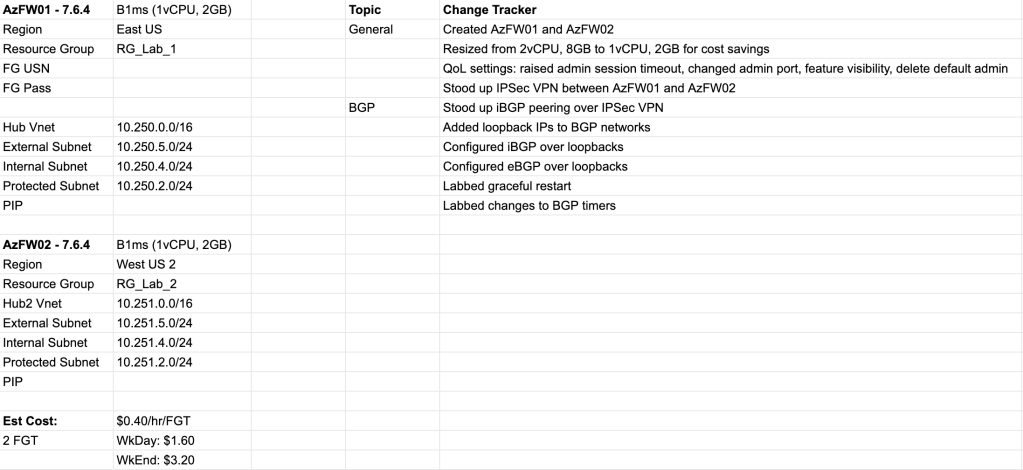 On Monday, I shot an email off to our company’s Fortinet AM and SE (Sales Engineer) with a list of about 4 questions (see blog 4 for the list – it’s mostly specifics about FortiOS versions and past certs) and a request for some additional resources such as Fortinet Developer Network access and hopefully some evaluation licenses for all of the products included in the NSE8 syllabus. To be fair it was quite a few specific questions and asks… I’m sure they’ll get back this week. Until then I’ll stick with the PAYG, which is a maximum of 10 or 15 dollars a week with the 2 FGT VMs. I always make sure to shut these down after each lab session.