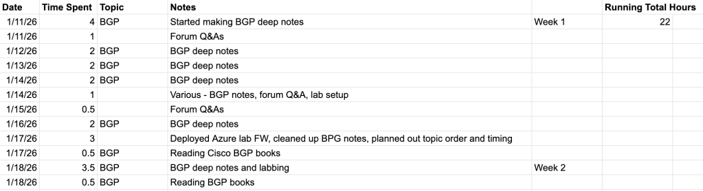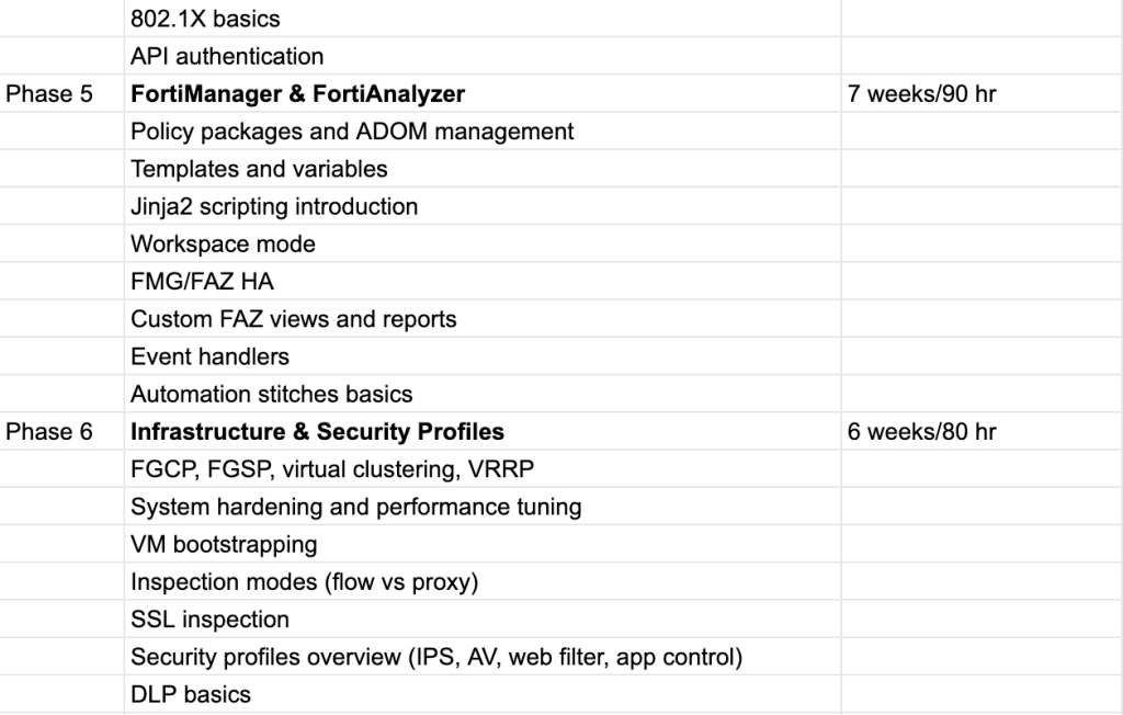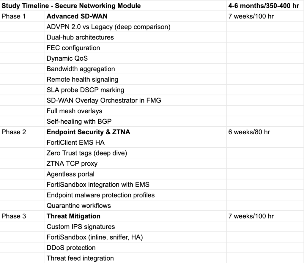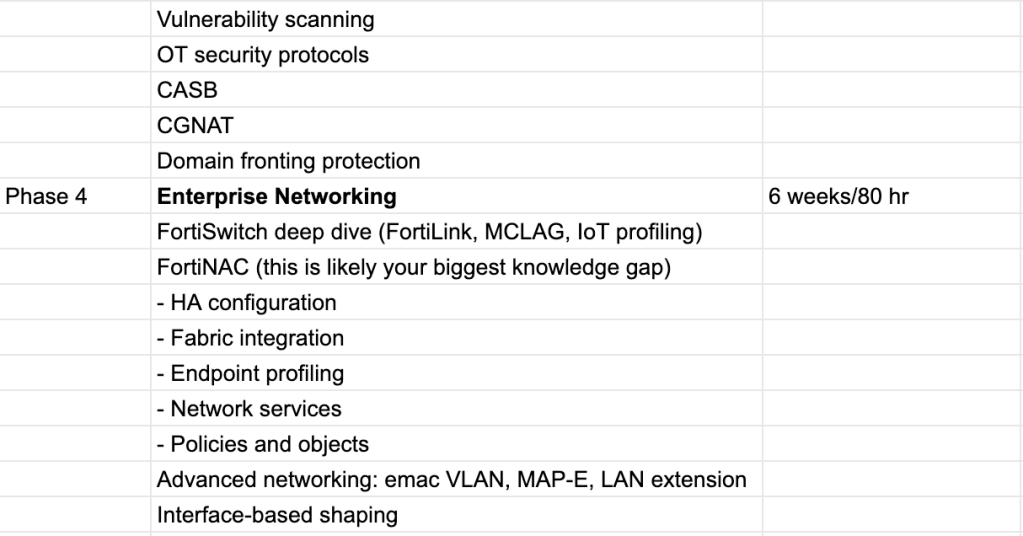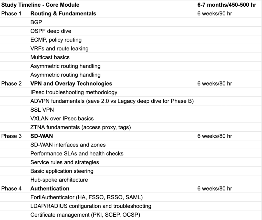 First off, for background here, I created this outline with Claude AI. I gave it the NSE8 Pre-Release PDF, and some context on my available time per week and network experience. It produced these two timelines for the NSE8 modules. I certainly won’t be sticking to these exactly, but they provide a basic structure to go off of.