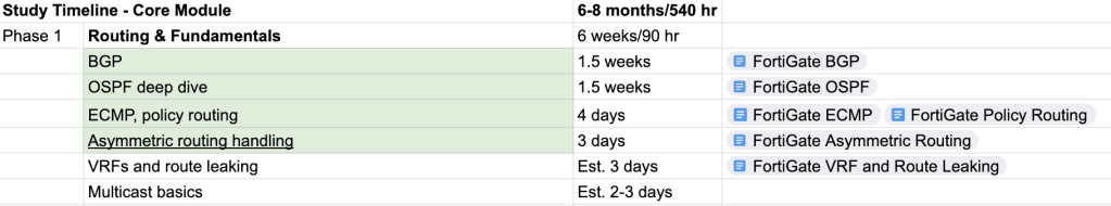 Asymmetric Routing was not as breezy but it taught me a lesson that’s already paying off. I’ve been working with an enterprise network with asymmetric routing enabled for the past year or so, and I’ve also learned about its mechanics while studying for previous Fortinet certs, but I hit a weird spot when I first began the deep notes. It was a weeknight so I only had a 2 hour study session, but I noticed that at the end of the session I still didn’t actually understand how asymmetric routing was treated by the FortiGate. Between RPF check understanding, asymroute vs auxiliary session, TCP without SYN, and the various articles explaining what asymmetric routing looks like in debugs and sniffers – I couldn’t fit all the pieces together. There was simply too much I did not yet understand; and at the end of the session I felt the disconnection and quite overwhelmed.