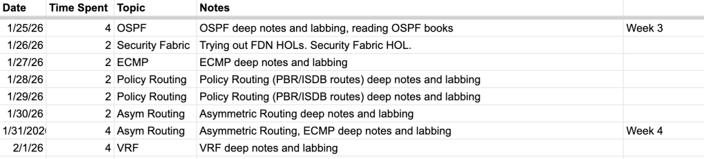 ECMP and Policy Routing are both fairly straight forward and intuitive. The deep notes and basic labbing for both of these topics only took a day each – at least working through the existing Fortinet documentation and working with AI to identify gaps in my notes and some common situations to lab out. I did end up coming back to ECMP on Saturday for a bit more lab time.