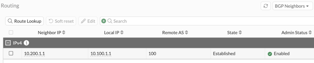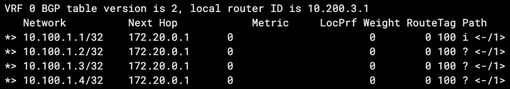 You can imagine how valuable this becomes, especially if you’re advertising hundreds or thousands of specific routes. One thing to note is that 10.100.1.0/28 includes the IP host range 10.100.1.1 – 10.100.1.14, meaning our peer will route 10.100.1.9 – 10.100.1.14 to us, even though we don’t actually have a route to these hosts.
