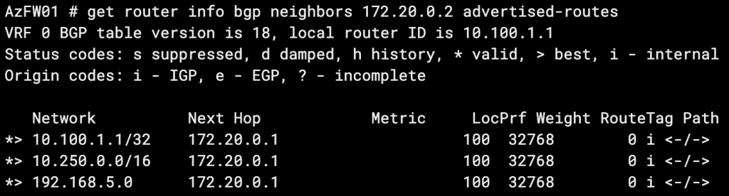 By default, BGP will not advertise a route included in its networks configuration if the route doesn’t already exist in the FortiGate’s routing table. For example, you may include the 192.168.5.0/24 route in your BGP config because that subnet represents a connected interface on your FortiGate. BGP will be able to advertise the route because there is already a 192.168.5.0/24 directly connected route in the RIB. If you attempt to advertise a route via BGP that you don’t have a route for, it won’t be sent out. You can allow this non-default behavior with the set network-import-check disable setting.