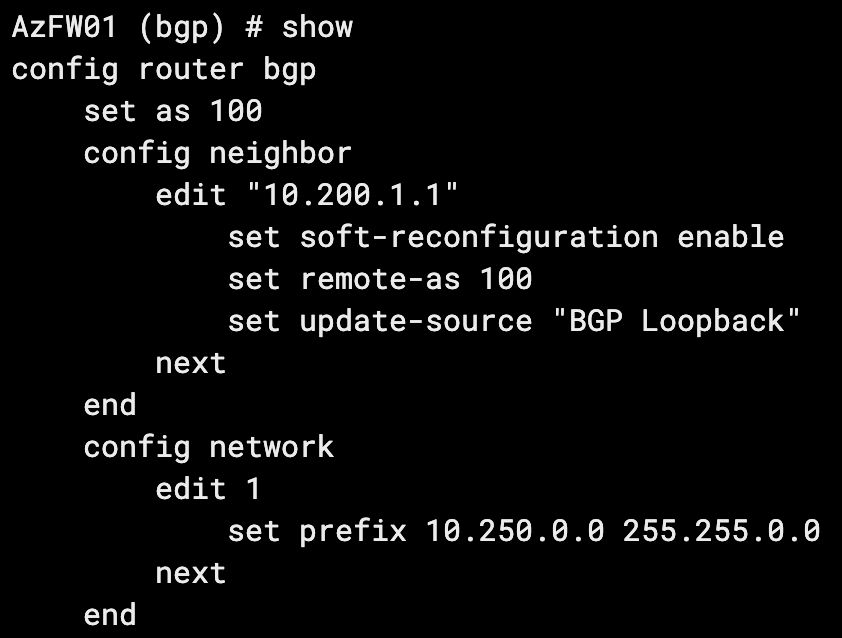 This routing configuration is commonly recommended in the networking community for its scalability and simplicity. OSPF is configured to share routes to loopback IPs. BGP is sourced from the same loopback IPs to allow for dual-WAN and multiple IPSec tunnels from each spoke router without having to stand up multiple BGP peerings. Here’s how to configure it in its simplest form between two FortiGates.