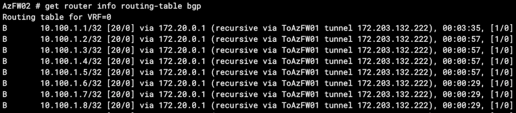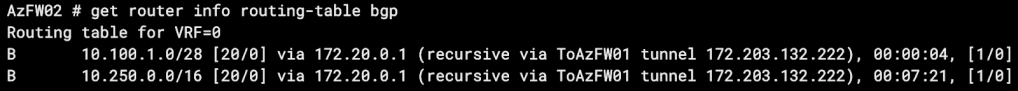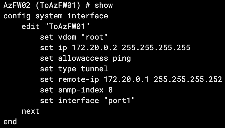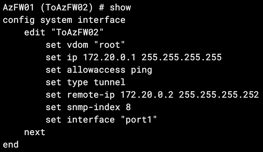 For this example, my lab is running two Azure FortiGate VMs, connected via an IPSec tunnel. Our loopbacks and tunnel IPs are as follows: