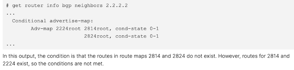 - The route maps listed within set condition-routemap are the conditions that must be met in order to execute the advertise-routemap (“2224” in this example).