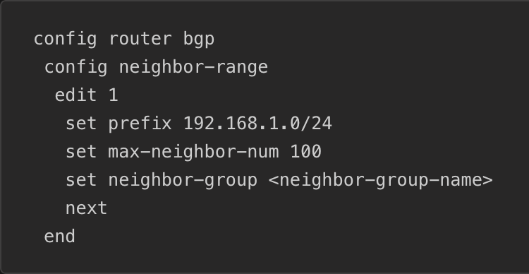 As seen in the section above, you can also apply a neighbor-group from within a neighbor-range, which will set the neighbor-group conditions to any peers within the specified range.