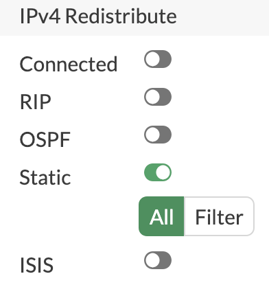 In our BGP settings we simply turn on Static redistribute and the routes will be advertised: