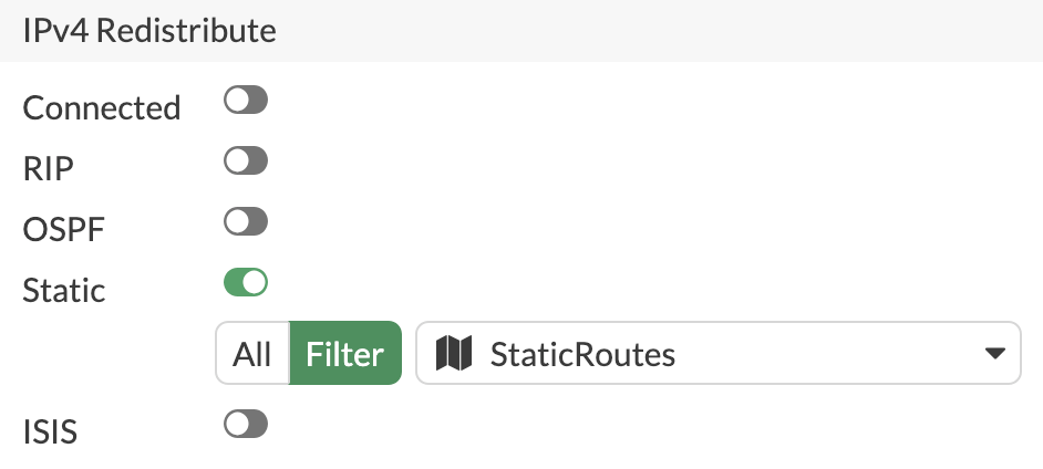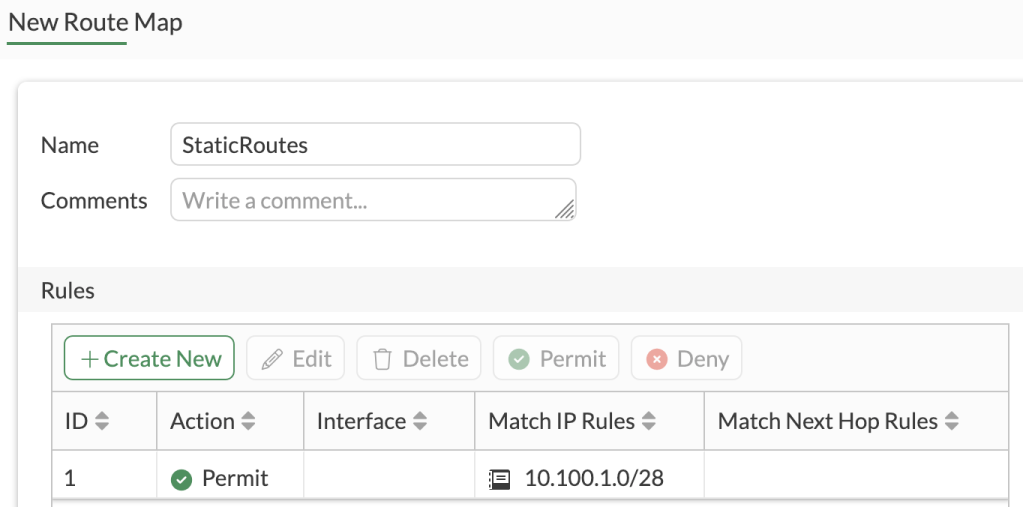 However, in our lab, we actually have quite a few additional static routes that we don’t want our peer to know about, so we’ll apply a filter. We only want to advertise our routes that fall within the 10.100.1.0/28 subnet, so we’ll create an Access List to match that subnets within (exact match disabled). We’ll then create a Route Map with an Allow rule matching the Access List, and apply that Route Map to the Static redistribution configuration.