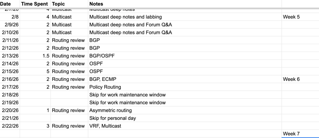 I’m coming up on the end of our first section, routing, after right around 100 hours of studying. Let’s get to the tracker: